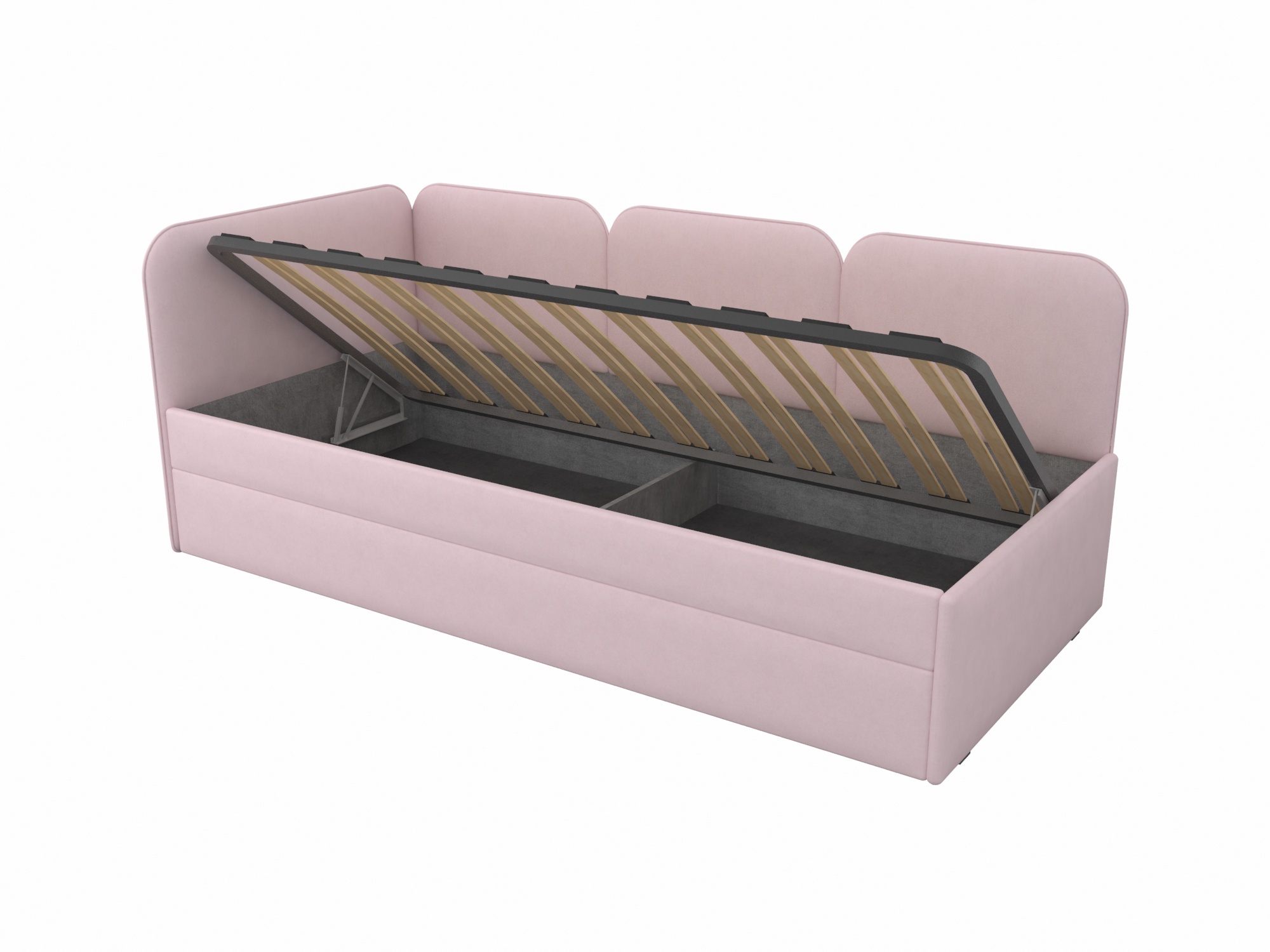 Мягкая кровать с выразительными скругленными спинками - универсальная база для интерьеров детских комнат.