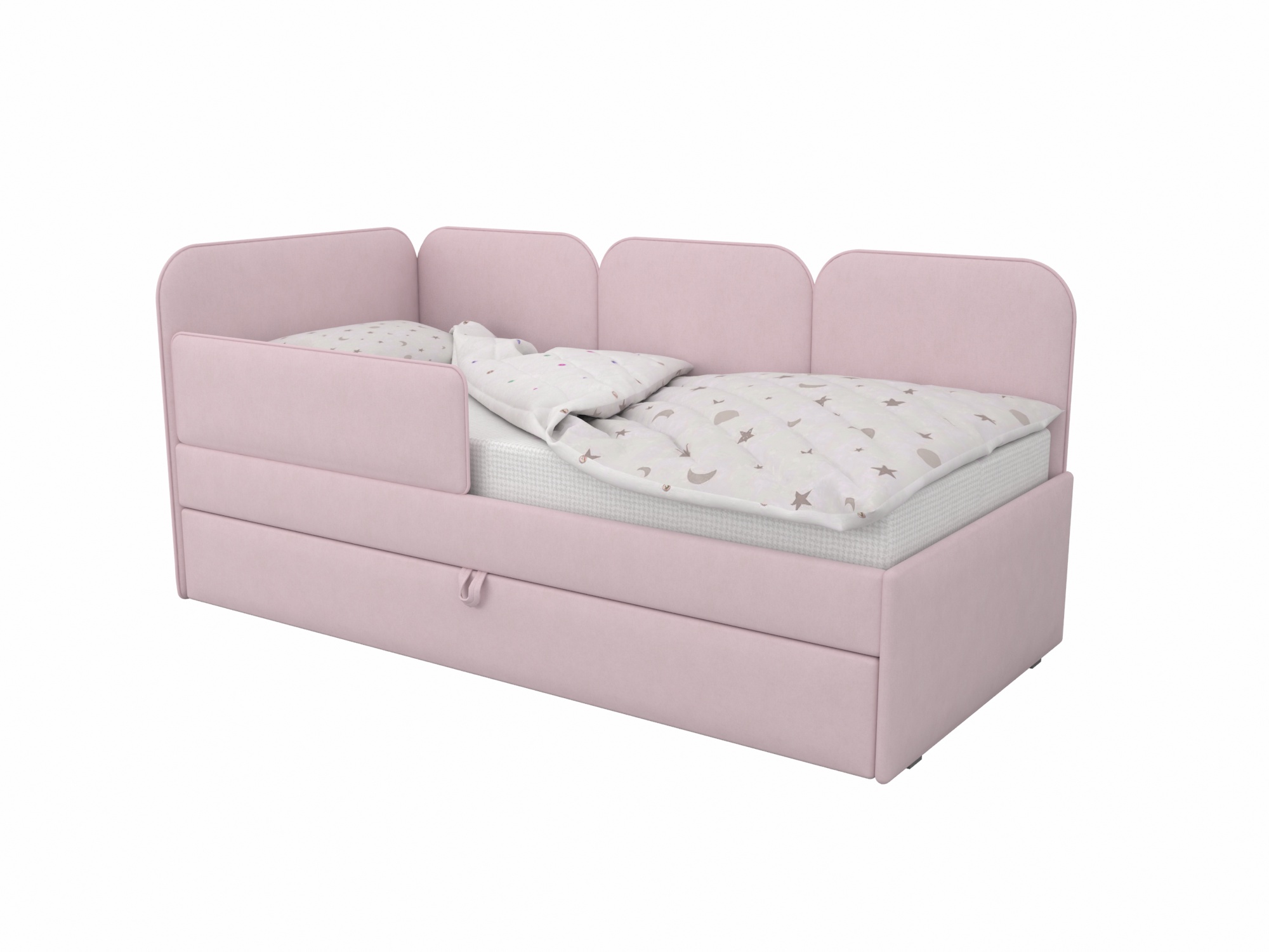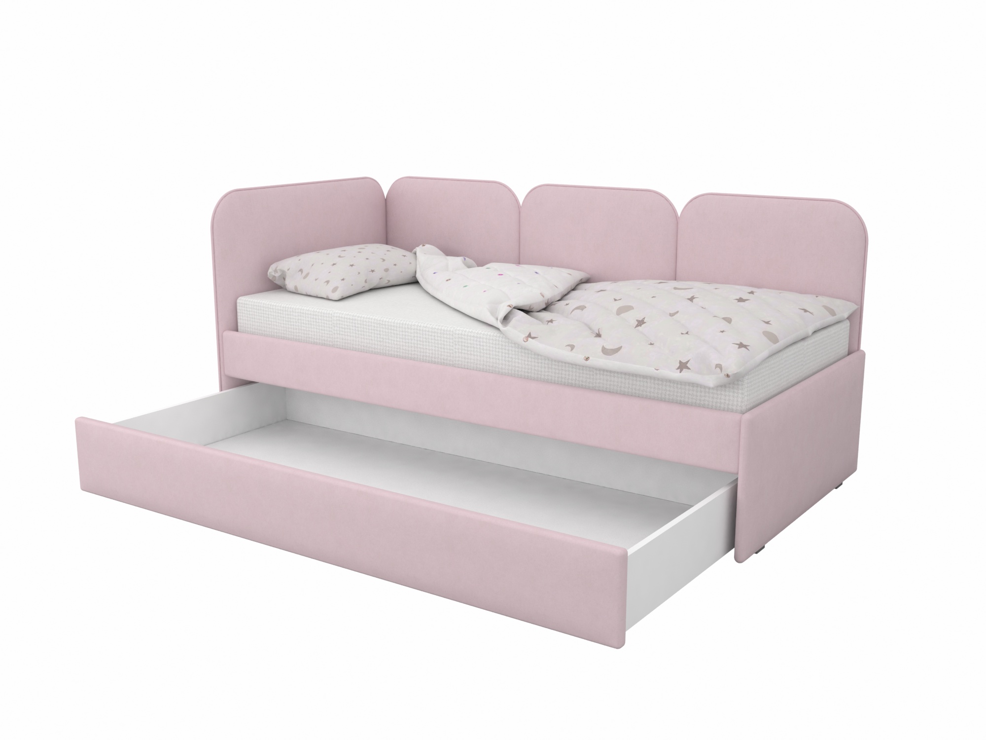 Мягкая кровать с выразительными скругленными спинками - универсальная база для интерьеров детских комнат.